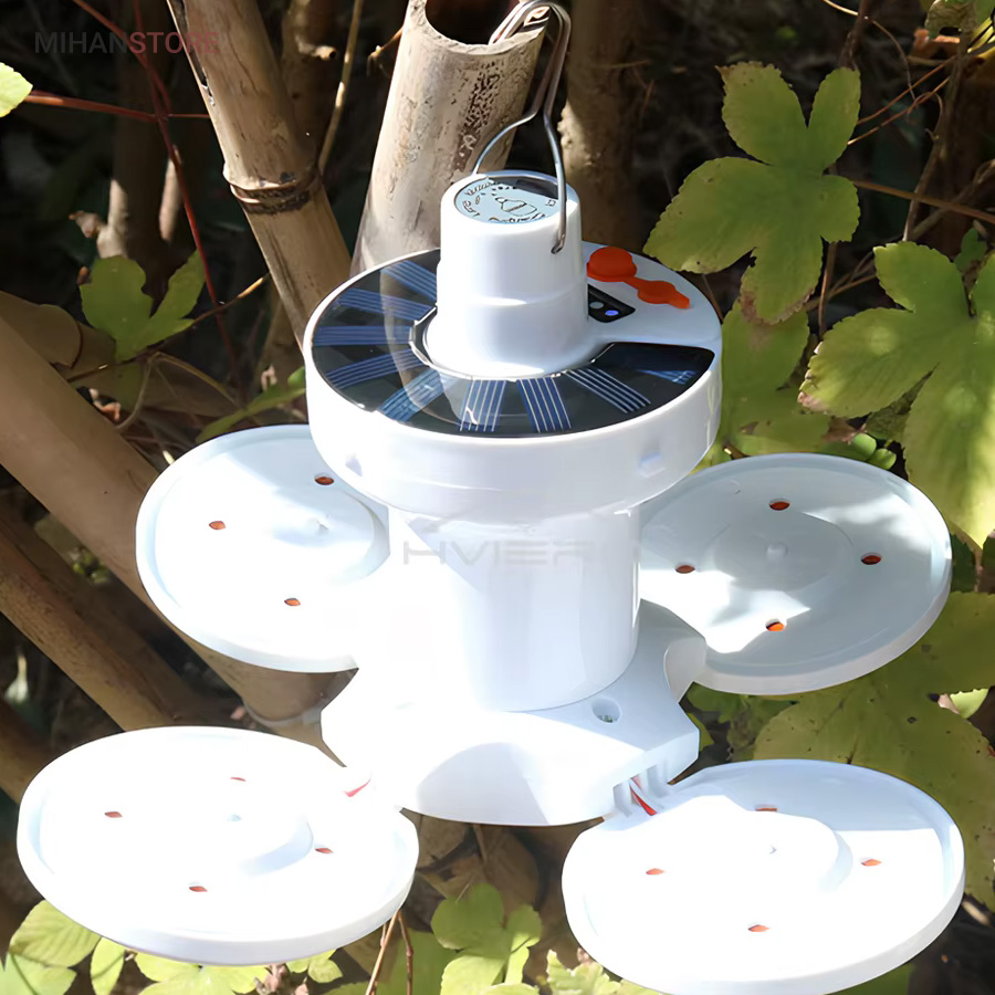 از ویژگی های دیگر این لامپ داشتن صفحه سولار می باشد و این خود می تواند بهترین کمک را در ذخیره انرژی داشته باشد، همچنین دارای میزان روشنایی 800 لومن و چراغ نشانگر شارژ در قسمت بالای لامپ نیز می باشد. منبع تغذیه لامپ توسط پنل خورشیدی و همچنین آداپتور می باشد. برای شارژ کامل لامپ، 5 ساعت زمان لازم است و با هر بار شارژ کامل، می توانید به مدت 6 تا 8 ساعت از نور آن استفاده کنید. باز شدن چهار ال ای دی این چراغ سولار زیبایی آن را دوچندان کرده است.سایز لامپ در حالت بسته (مدل توپ) 16x14x16 سانتیمتر میباشد در حالت سقفی باز 30x16x30 سانتیمتر می باشد.